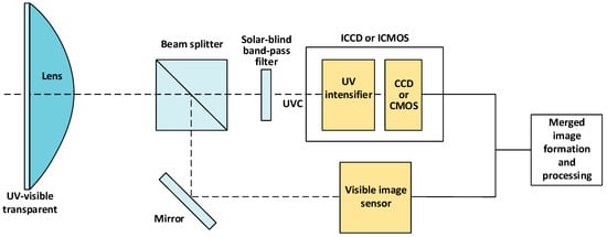 Most dual-band cameras use a solar-blind UVC filter combined with an image-intensified CCD (ICCD) [] or an intensified CMOS (ICMOS) [,,,], as illustrated in Figure 7.