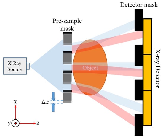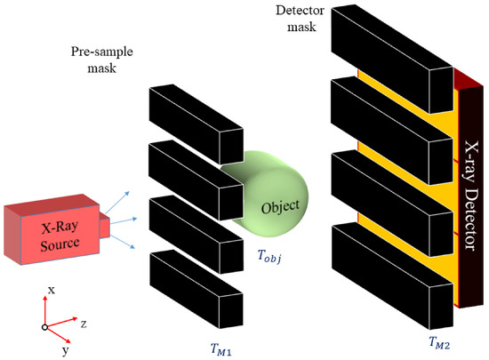 Both PB-XPCi and EI-XPCi systems can be mathematically modelled based on electromagnetic wave transmission through objects and propagation in free-space. Figure 1 illustrates the components and geometry of an EI-XPCi system model. It consists of an X-ray source, a pre-sample absorption mask, an object, a detector absorption mask, and an X-ray detector. It is assumed that the pre-sample mask and detector mask are at the object plane and detector plane, respectively. Following the Fresnel–Kirchhoff integral to describe the propagation of X-rays between source and object, as well as object and detector, the expected signal intensity at position registered at the detector plane——can be expressed through Equations (1)–(6):