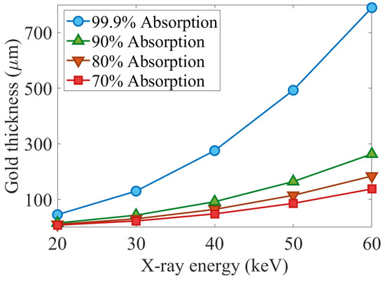 It is worth mentioning that the mass thickness is defined as the mass per unit area, and is obtained by multiplying the thickness by the density , i.e., . Gold is selected as the X-ray absorber for absorption masks design since it is widely used in X-ray mask fabrication. Figure 2 illustrates the required thickness of gold (for an absorption mask) versus X-ray energy so the X-ray can be stopped in an absorption mask.