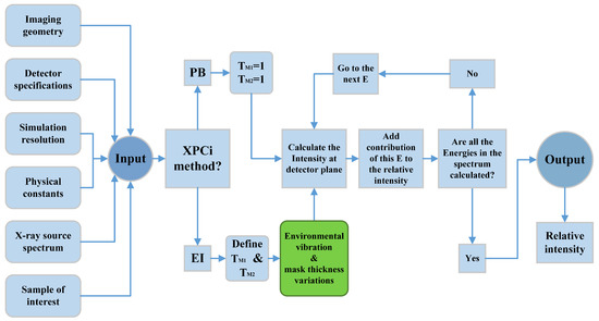 Algorithm used to simulate the model for both PB-XPCi and EI-XPCi configurations in MATLAB®. The green block represents where absorption mask thickness variation and mechanical vibration are defined in the model.