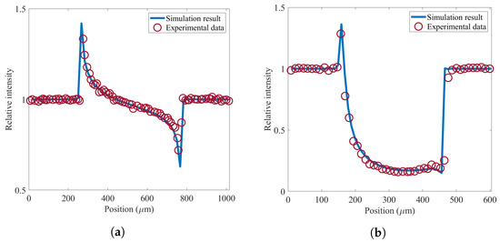 To verify the model, simulation results are compared with experimental data from [25] (using a quasi-monochromatic X-ray beam with an energy of 20 keV), which are illustrated in Figure 4. Simulation is done assuming a quasi-monochromatic Gaussian distributed X-ray source with FWHM = 80 m at 40 kV (equal to 20 keV); source to sample distance of 20 m and sample to detector distance of 0.55 m; as well as 50% illumination fraction (for EI-XPCi setup) for two different samples: polyetheretherketone (PEEK) wire with a diameter equal to 460 m, and titanium wire with a diameter equal to 250 m. PEEK is selected as an almost transparent object to the X-ray energy considered for this comparison, hence it reveals an intensity profile that is mainly due to phase shift rather than attenuation contrast; and Titanium is chosen as an object which presents a strong absorption, thus a wide range of conditions is covered to verify the model.