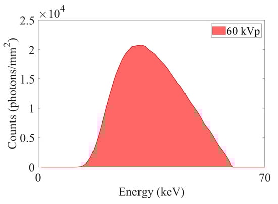 The model explained in the previous section is employed to investigate the PB-XPCi and EI-XPCi systems and to evaluate them, where we have considered a polychromatic microfocus X-ray source working at 60 kV with a spot size equal to 9 m (except for studying the effect of on the imaging performance where we consider a spot size equal to 2 m) and a detector with pixel size and pitch equal to 7.8 m for a PEEK wire with a diameter equal to 585 m as the object of interest. Figure 5 illustrates the X-ray spectrum employed in this work to simulate the model.