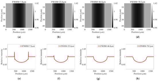 The effect of detector modulation transfer function () on image quality and relative intensity. (a,e) represent a direct conversion detector with a pixel size equal to 7.8 m. (a,e) represent a direct conversion detector with a pixel size equal to 7.8 m. (b,f) represent a direct conversion detector with a pixel size equal to 23.4 m. (c,g) represent a direct conversion detector with a pixel size equal to 46.8 m. (d,h) represent a direct conversion detector with a pixel size equal to 70.2 m. Simulation is done for a PEEK wire with 585 m in diameter using a polychromatic microfocus X-ray source working at 60 kV with a spot size equal to 2 m to only study and highlight the effect of on the system performance.