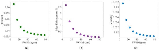 Simulation results confirm that, increasing the of the detector PSF lowers the contrast, edge-enhancement, and visibility of a PB-XPCi system (the same results can be expected for an EI-XPCi system), as illustrated in Figure 7. The highest value in the three graphs in Figure 7 (at m) corresponds to a direct conversion detector with a pixel size equal to 7.8 m, and higher values in Figure 7 represent an indirect conversion detector (with the same pixel size).