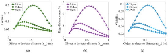 With , , and being the source-to-object, object-to-detector, and source-to-detector distances, investigation of contrast, edge-enhancement, and visibility characteristics are carried out for PB-XPCi as a function of , considering the fact that is kept constant—105 cm. In other words, PB-XPCi is evaluated at different magnification scenarios (between 1.05 to 21) when is changing between 5 cm to 100 cm, and is always kept constant—equal to 105 cm. Figure 8a–c illustrate the contrast, edge-enhancement, and visibility for a PB-XPCi system. In order to highlight the role of a high-resolution detector in the imaging performance, three different pixel sizes of 7.8 m, 23.4 m, and 39 m are simulated all through the same imaging system condition. Reducing the pixel size results in an enhancement in the detected signal, which leads to higher contrast, edge enhancement, and visibility. Since PB-XPCi systems require high spatial coherence X-ray sources to reveal the phase-contrast effect, phase shift drops for lower spatial coherence components. This is noticeable in Figure 8a–c, where increasing in —in other words higher magnifications—results in lower contrast, less edge-enhancement, and less visibility. On the other hand, contrast, edge-enhancement, and visibility experience lower values when the object is close to the detector—at lower , since the phase effect has not yet been evolved due to a lower propagation distance between the object and detector.