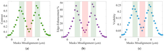 An EI-XPCi system performance relies on parameters such as its masks dimensions, detector pixel size, as well as X-ray source energy; thus, and should be selected and optimized based on the system configuration, and they should be kept fixed, since altering their values affect the system behavior. As a result of that, contrast, edge-enhancement, and visibility are investigated as a function of masks misalignment—which results in different illumination fractions—for the EI-XPCi system. Investigation of the EI-XPCi system is done based on a 7.8 m pixel size detector; a pre-sample mask with 1.56 m aperture and 6.24 m period; a detector mask with 1.17 m aperture and 7.8 m period; of 18 cm; and equal to 4.5 cm. The aperture and period of pre-sample and detector masks are designed based on the X-ray source specifications, distances, and pixel size. Although the detector mask aperture can be greater than the aperture of the pre-sample mask, we designed it to be smaller to minimize the effect of source blurring and to cover different scenarios in changing the masks misalignment. An EI-XPCi system behavior highly depends on where the beamlets, which exited the pre-sample mask, land on the detector mask. Considering a beamlet to exemplify the situation, three different scenarios could occur: (1) the whole beamlet impinges upon the absorption part of the detector mask (Figure 1), therefore nothing is detected; (2) a portion of the beamlet is absorbed by detector mask and the rest is registered by the pixel—this is the definition of edge-illumination; (3) the beamlet is fully landed within the detector mask aperture. Since only the second scenario leads to edge-illumination behavior, this is worth mentioning that, for mask misalignment, there is a point (or a number of points) at which the system operates to its highest potential for image acquisition. Figure 9a–c illustrate the contrast, edge-enhancement, and visibility of the EI-XPCi system when masks are misaligned over the span of one pre-sample mask period to demonstrate the behavior of the system. The two vertical green bars in Figure 9a–c highlight the regions at which EI-XPCi system reveals the highest contrast (also edge-enhancement and visibility). The middle vertical red bar in Figure 9a–c represents the first scenario where the beamlets of X-ray are fully absorbed by the detector mask, and no signal is detected (without any object present). On the contrary, the far left and far right plateaus are where approximately all of the X-rays are registered by the detector (without any object present).