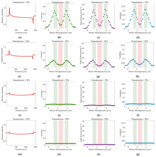 Figure 10 illustrates simulation results of the impact of detector mask thickness variation on the behavior of a high-resolution direct conversion detector (with 7.8 m pixel size) for an EI-XPCi system. It shows that transmissions up to 30% of the incident X-ray through absorption masks will not considerably change the behavior of the EI-XPCi system (Figure 10a–h). However, transmissions of more than 40% of the incident X-ray through absorption masks result in the EI-XPCi system experiencing a slight change in its behavior—shifting from EI to PB behavior. Transmissions of more than 70% of the incident X-ray through absorption masks highlight the behavior of a PB-XPCi system rather than an EI-XPCi one (Figure 10i–p). The gradual shift from EI to PB behavior, as detector mask thickness decreases, is associated with the increased background signal. The detector mask blocks a portion of incoming beamlets to realize an EI-XPCi system, where any imperfections with the detector mask would result in the EI-XPCi system performance loss. The same shift in behavior, from EI to PB, exists for imperfections in the pre-sample mask, where, in this scenario, impure beamlets generated from an imperfect pre-sample mask result in losing the EI behavior, which is detecting individual beamlet changes.