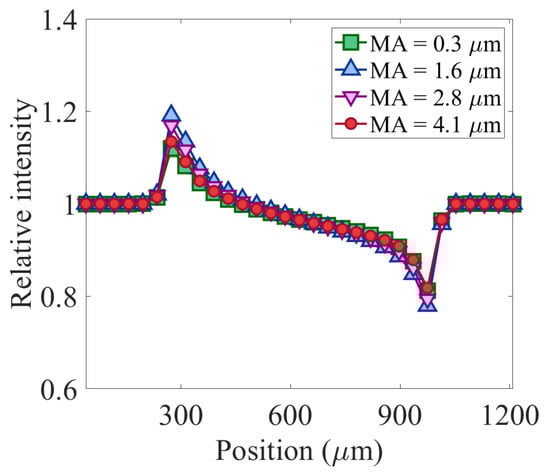 Simulation results confirm that high-resolution EI-XPCi systems are sensitive to environmental vibration, where their behavior changes dramatically when mask misalignment swings even in the range of 2 micrometres. However, EI-XPCi systems with bigger pixel sizes are not influenced noticeably by this misalignment. Figure 12 illustrates how environmental vibration within the range of two micrometres does not have a noticeable effect on the behavior of the system with 39 m pixel size. On the other hand, as Figure 13 shows, the same environmental vibration in higher resolution detectors (in this case, a system with 7.8 m pixel size) significantly swings the system behavior between PB and EI modes.