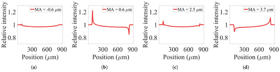 (a–d) Illustration of simulation results of the effect of environmental vibration on the performance of an EI-XPCi system with pixel size equal to 7.8 m × 7.8 m. The behavior of the system dramatically changes even with less than one micrometre shift in the mask misalignment.