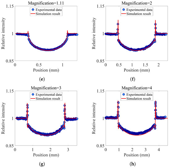 Here, we present BrillianSe™, an amorphous selenium (a-Se) integration mode X-ray detector, which employs a hybrid a-Se/CMOS detector technology. This high-resolution detector was initially developed at the University of Waterloo, and is now commercialized by a University of Waterloo spin-off company, KA Imaging Inc. [21,22,29]. The a-Se photoconductor possesses a high intrinsic spatial resolution and is utilized in this X-ray detector in the direct conversion mode. The 7.8 m pixel pitch BrillianSe™ prototype used in this work has micron-scale resolution and high detection efficiency for energies >20 keV. We used this detector in a PB-XPCi configuration to demonstrate the potential of this high-resolution X-ray detector. The edge-enhancement effect in PB-XPCi at different geometric magnifications for a Polytetrafluoroethylene (PTFE) rod (with a thickness of 0.7 mm) employing a prototype version of BrillianSe™ X-ray detector—1000 × 1000 pixels with 7.8 m pixel pitch; a tungsten target Thermo Scientific™ PXS5-927 Microfocus X-ray Source (from Thermo Fisher Scentific Inc., Waltham, MA, USA) working at 60 kV, 134 A, and focal spot size of 9 m; as well as the source to object distance of = 18 cm is demonstrated in Figure 14. As we increase the distance between the object and the detector (by keeping the source to object distance constant and equal to = 18 cm), the edges of the object—where the refractive index changes abruptly—become more detectable. Figure 14a–d illustrate phase-contrast images of the PTFE rod at different geometric magnifications, and Figure 14e–h demonstrate cross-sectional view of the relative intensity profile at different object to detector distances, correspondingly. A good agreement between the simulated model and experimental results can be found here.
