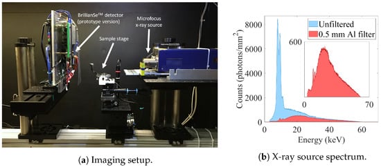 (a) The experimental setup used for PB-XPCi imaging with the tungsten target Thermo Scientific™ PXS5-927 Microfocus X-ray Source, sample stage, and a prototype version of the BrillianSe™ X-ray detector; (b) the spectrum of the source used for imaging—both the unfiltered and 0.5 mm Al filtered spectrum.
