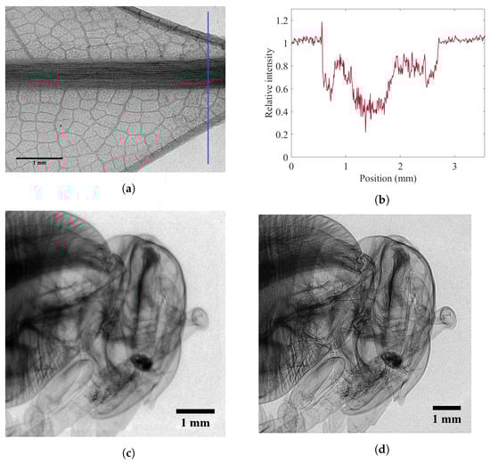 (a) Phase-contrast image of a dried bay leaf using a prototype version of the BrillianSe™ X-ray detector and a microfocus source at 60 kV, = 18 cm, and = 8 cm; (b) profile of relative intensity along the vertical cross-section (blue line); (c) X-ray attenuation image of a bee head imaged at 60 kV, = 18 cm, and = 1 cm; (d) X-ray phase-contrast image of the same bee head imaged at 60 kV, = 18 cm, and = 8 cm.