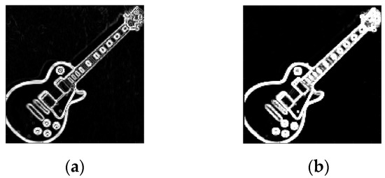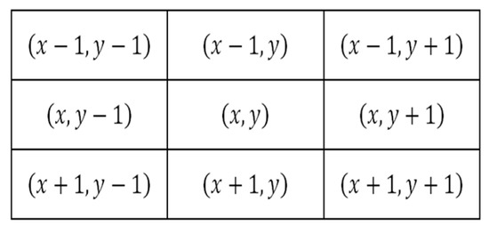 Gi (where I = 1…4) represents the direction of the edge (gradient). It is calculated with Equation (11) by using a 3 × 3 kernel. In Equation (11), zi represent the coefficient of each of the matrix positions shown in Figure 2b, where the coefficients are calculated with Equation (12); f is the representation of the image, i.e., the x-axis for the columns, and y-axis for the rows. The edge value is denoted with the variable “Edges”, which is integrated using Equation (13) [13,25,45].