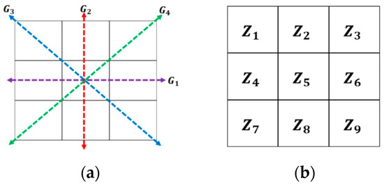 MG is an edge-detection technique that calculates the first derivate of an image in the four orientations of the image, i.e., vertical, horizontal, and its diagonals (). This is demonstrated in Figure 2a, where the gradients are indicated by the following variables G1, G2, G3, and G4. The calculation of the gradients is made in the following way.