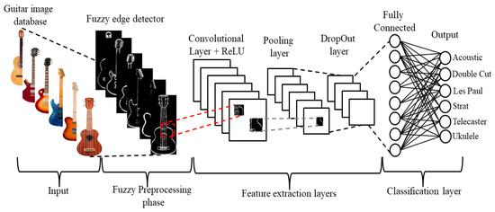 Deep neural networks have demonstrated the capability of solving classification problems using hierarchical models, and fuzzy image preprocessing has proven to be efficient in handling uncertainty found in images. This paper presents the combination of fuzzy image edge-detection and the usage of a convolutional neural network for a computer vision system to classify guitar types according to their body model. The focus of this investigation is to compare the effects of performing image-preprocessing techniques on raw data (non-normalized images) with different fuzzy edge-detection methods, specifically fuzzy Sobel, fuzzy Prewitt, and fuzzy morphological gradient, before feeding the images into a convolutional neural network to perform a classification task. We propose and compare two convolutional neural network architectures to solve the task. Fuzzy edge-detection techniques are compared against their classical counterparts (Sobel, Prewitt, and morphological gradient edge-detection) and with grayscale and color images in the RGB color space. The fuzzy preprocessing methodologies highlight the most essential features of each image, achieving favorable results when compared to the classical preprocessing methodologies and against a pre-trained model with both proposed models, as well as achieving a reduction in training times of more than 20% compared to RGB images.