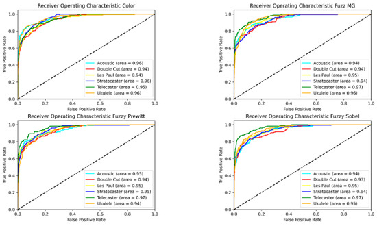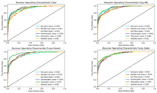 The results can be validated with the ROC curves shown in Figure 10 and Figure 11, which show the sensitivity and specificity of the models. We can observe that each class in every model has a similar performance, where the models are performing a decent separation of the classes. The models present a similar level of area under the curve (AOC) due to the relatively small differences between them; we found no more than a 2% difference between preprocessing methodologies and no more than a 5% difference between the best CNN-I models compared to the best of CNN-II models.