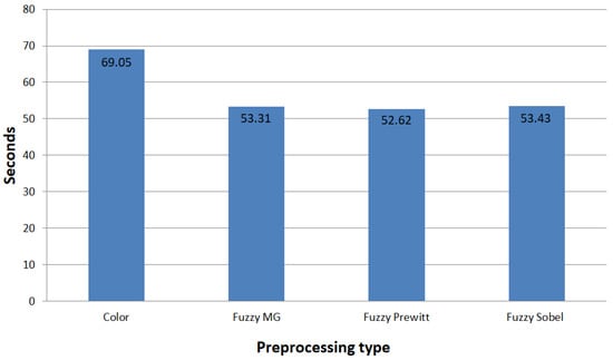 The ROC curves shown in Figure 10 and Figure 11 demonstrate similar behavior in terms of accuracy between the fuzzy preprocessing and the color (RGB) images. To evaluate the effectiveness of the proposed methodologies in both architectures, we performed a time analysis by training 30 independent models, to evaluate the average training time, and we calculated the average preprocessing time for the images (Figure 12 and Figure 13). With CNN-I, we noted a reduction by an average of 23% in the training time with the fuzzy preprocessing. In the case of CNN-II, we had a reduction in time of 18.5% with the more complex architecture. In both instances, we managed to achieve similar accuracy rates with a significant reduction in training time. These reductions can be significant in similar applications in which the models need to be trained with more information.