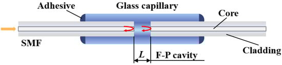 The core part of a fiber-optic F–P sensor is an F–P cavity, which is typically composed of two parallel reflecting surfaces. Figure 1 shows the typical structure of a fiber-optic F–P sensor. Two vertically cut single-mode optical fibers (SMFs) were inserted into a glass capillary. The two separated end faces of the two SMFs form an F–P cavity.