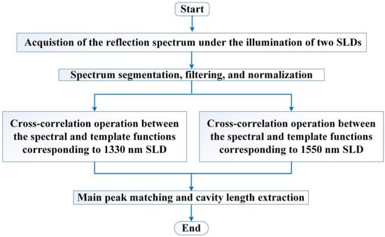 To overcome these problems of previous cross-correlation algorithms, in this study, we propose a high-precision cavity length demodulation method for fiber-optic F–P sensors based on the simultaneous use of two SLDs with different central wavelengths and a combination of two cross-correlation operations corresponding to two spectral ranges. Two cross-correlation curves between two reflected spectral signals in two different wavelength ranges and the respective template functions are calculated, and the most matching peaks are determined as the main peaks. The real cavity length is extracted as the average value of the two calculated cavity lengths corresponding to the two main peaks of the two cross-correlation curves. With the proposed method, the lower limit of the cavity length range that can be demodulated has been significantly extended. Theoretical analysis, simulations, and real demodulation experiments were conducted to verify the proposed demodulation method.