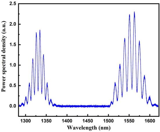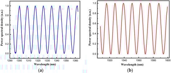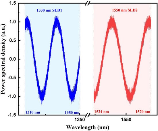 First, a fiber-optic F–P sensor with a cavity length of 40 μm was simulatedly demodulated. The reflection spectrum of the sensor under the illumination of two SLDs is shown in Figure 4, in which the two SLDs were supposed to have a center wavelength of 1330 and 1550 nm and a 3-dB spectral range of 1310–1350 nm and 1524–1570 nm, respectively. These parameters were in agreement with the actual spectra of the SLDs used in the experiments.