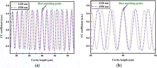 The reflection spectrum of the 100.214 μm fiber-optic F–P sensor is shown in Figure 10. The spectrum is treated using the proposed algorithm. The normalized spectral functions corresponding to the spectral ranges covered by the 1330 and 1550 nm SLDs are shown in Figure 11a,b, respectively. Cross-correlation calculations were performed for both spectral functions for a template cavity length range of 96–104 μm, and the two cross-correlation curves were superimposed, as shown in Figure 12. The best matching peaks were found to be near the template cavity length of 100 μm. Therefore, the main peaks of both cross-correlation curves were determined. Following a peak positioning process, and averaging the cavity lengths, the cavity length was calculated to be 100.218 μm, which deviates from the standard cavity length by 0.004 μm, and the relative deviation is 0.004%.