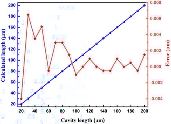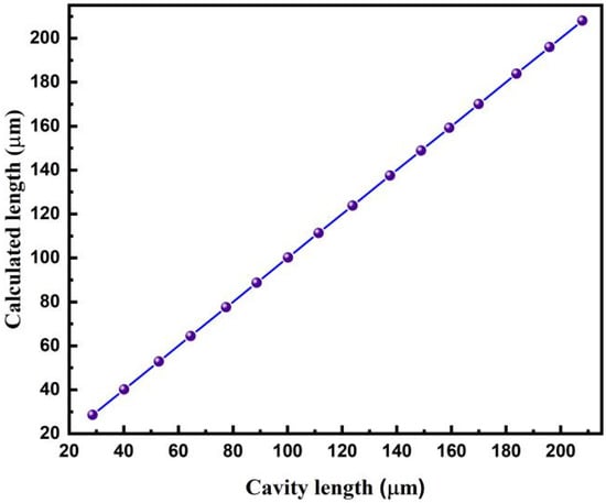 To further investigate the performance of the proposed method, 19 different fiber-optic F–P sensors with cavity lengths in the range of 20–200 μm were demodulated. The demodulation results are shown in Figure 6. An excellent linear relationship can be observed between the demodulated length and the preset cavity length, in which the maximum cavity length deviation is only approximately 0.0065 μm and the relative deviation does not exceed 0.022%.