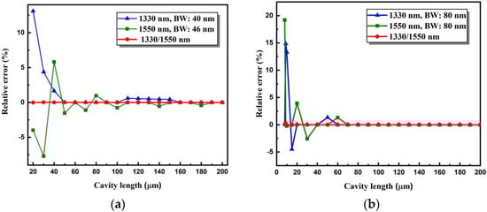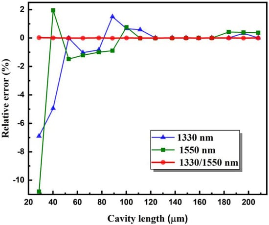 Under the same conditions, these fiber-optic F–P sensors were demodulated with only a single SLD. The relative deviations of the calculated cavity lengths obtained from the cross-correlation curve of a single SLD of 1330 or 1550 nm are shown in Figure 7a. It can be found that, especially for cavity lengths less than 100 µm, the demodulation deviations obtained by our proposed method are significantly smaller than those obtained using a single source. Therefore, the proposed dual SLD cross-correlation cavity length demodulation method can solve the problem of the main peak judgment ambiguity when the cavity length of the fiber-optic F–P sensor is too short or when the spectral width of the single light source used is too narrow. Using this method, fiber-optic F–P sensors with relatively short cavity lengths can be accurately demodulated.