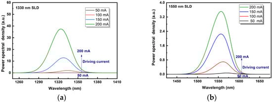 Output spectra of the two SLDs with central wavelengths of (a) 1330 nm and (b) 1550 nm under different driving currents.
