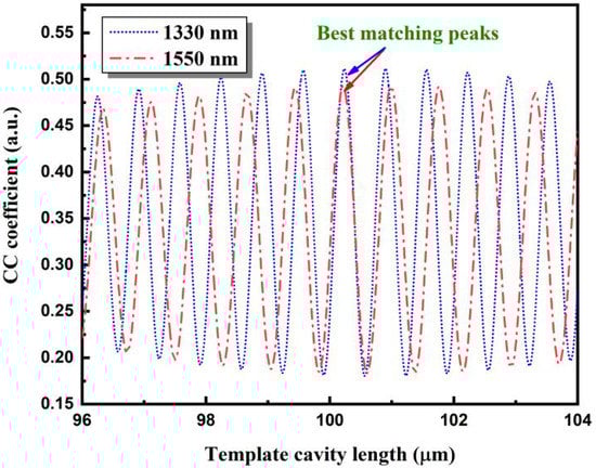 Both cross-correlation curves oscillate with increasing or decreasing template cavity length. The cross-correlation curves exhibited many different peaks. One peak in the cross-correlation curve reaches its maximum, which is called the main peak. At this peak, the template cavity length is equal to the real cavity length. However, because the differences between the main peak and its neighboring peaks are not obvious, the main peak is difficult to distinguish. This problem can be overcome by combining two cross-correlation curves that correspond to two different spectral ranges. From Figure 5, it can be observed that the two main peaks of the two cross-correlation curves are superimposed at the same position, and resemble each other the most. Thus, from this perspective, the main peak of the cross-correlation curves can be easily determined.