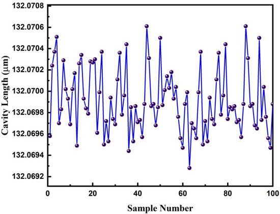 The demodulation resolution of the proposed method was also investigated by repeatedly demodulating a fiber-optic F–P sensor with a fixed cavity length. The measurement results with 100 continuous samplings are shown in Figure 15. The maximum demodulated cavity length was 132.071 μm, and the minimum demodulated cavity length was 132.069 μm. The range of the measurement change was approximately 0.0013 μm, and the standard deviation of the measurement results was 0.0005 μm. Therefore, the proposed method achieved a demodulation resolution of 0.0005 μm.