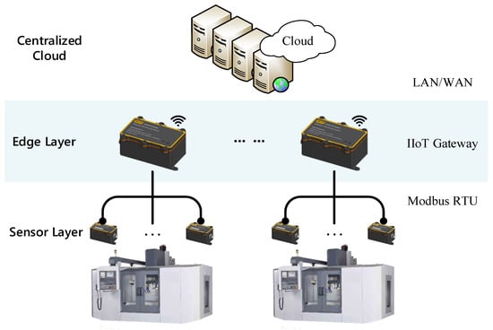 Machine condition monitoring is performed through IIoT devices organized as a hierarchy network. The proposed edge-to-cloud condition monitoring system with an unsupervised learning approach is illustrated in Figure 1. This system consists of three layers, including a centralized cloud, edge layer, and sensor layer. Smart sensor devices on the sensor layer collect the vibration signal on the manufacturing machines. The IIoT gateways of the edge layer implement the functions of signal conditioning, data acquisition, and signal preprocessing, whereas the unsupervised learning algorithms on the centralized cloud servers monitor the condition of the manufacturing machines and detect faults.