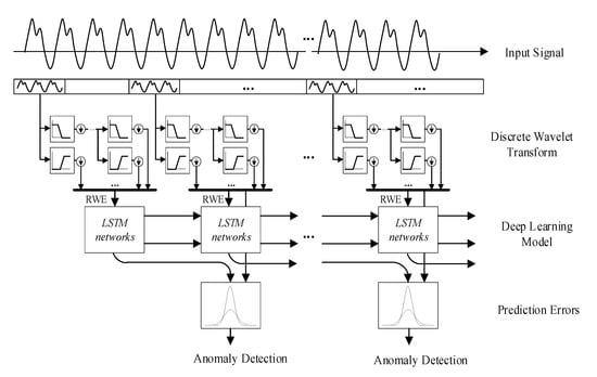 The overview of the proposed anomaly detection algorithm is shown in Figure 2; it consists of a discrete wavelet transform and relative wavelet energy calculation module to extract local features of a short discrete sampling window and an LSTM module for estimating the long-term trends. In this section, we initially introduce how the input data are processed on the edge layer and how the LSTM module is trained with the relative wavelet energy as the features, and then explain how to implement anomaly detection finally.