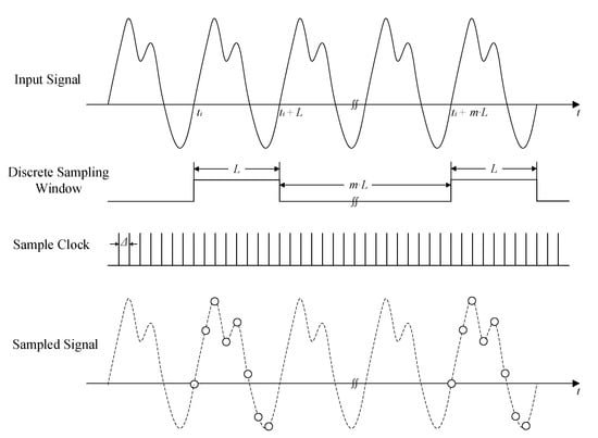 The time series , which is a temporal sequence of the observations, is considered, and is a reading at the n-th time point of the sensor output. The output signal of the sensors in the time series reflects the working condition of the system. L is a discrete sampling window length. The sequence in the sampling window at time ti is represented as , with the sampling interval Δ, where T = {ti}i=1,2,…, is the start time for each sampling window and . The signal digitization with the discrete sampling window method is shown in Figure 3.
