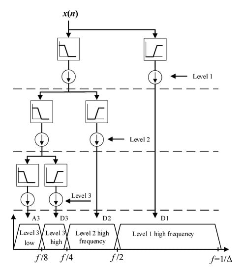 In our study, we apply the discrete wavelet transform (DWT) [20] to decompose the collected sensor signal in each sampling window . The discrete wavelet transform decomposes the given signal into a number of sets, where each set is a time series of coefficients at each decomposed level describing the time evolution of the signal in the corresponding frequency band. The signals are represented through a combined series expansion, namely, the approximation and the detail coefficients by the transform. We investigate the transform as the processing method used for the extraction of the features from the frequency information and location information. Figure 4 shows the discrete wavelet transform with three levels of high-pass and low-pass filter banks.