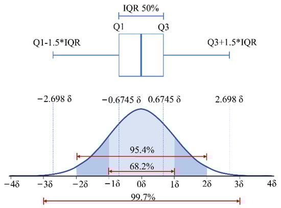 With the statistical tests, the prediction errors can be modeled as a normal distribution with the standard deviation, δ. The prediction error of the anomaly point resides far away from the normal data points, which are the majority of all the data points. The interquartile range (IQR) and standard deviation are metrics to measure the spread of values in a dataset, as shown in Figure 5. The IQR does not consider all the data points in the dataset, and it is concerned more about the positions of the data. However, the standard deviation considers all the data points of a dataset, also including the outliers. In general, if the data point is not within three standard deviations of the mean value, it should be considered an outlier. According to the empirical rule, 99.7% of the data observed, following a normal distribution, lie within three standard deviations of the mean [25]. Therefore, the data points that are not within three standard deviations of the mean value are identified as anomaly data. 3δ will be used as the threshold for anomaly detection in our research.