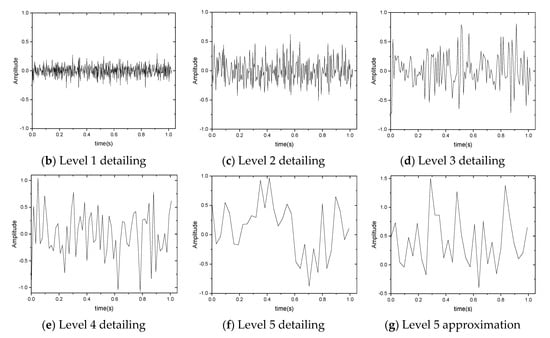 As shown in Figure 7, the discrete wavelet transform decomposes the input vibration sensor signal into five levels. The five detail coefficients are extracted from the decomposition levels with one approximation coefficient. The detail coefficients correspond to the high-frequency parts of each level. In addition, the approximation coefficient corresponds to the low-frequency part of the fifth level.
