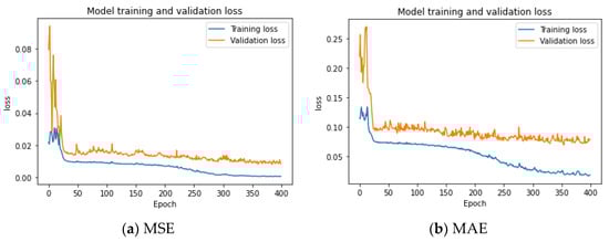 The relative wavelet energy for each level is calculated by Equation (1), then inputted to the LSTM to establish the optimal model for anomaly prediction in the condition monitoring system. The RWE–LSTM models are trained by an unsupervised method with training and validation datasets. The proposed model is a stacked LSTM with three subsequent layers and one fully connected layer. The function activation is the sigmoid function, and the model is set for 400 epochs. Considering the computational complexity and the model training performance, the Mean Squared Error (MSE) and Mean Absolute Error (MAE) loss functions are used for the model training and validation. The training and validation loss function graph for the LSTM model in the training period is shown in Figure 8. The training and validation loss curves decrease and become stable after 300 epochs. The performance and convergence behavior of the model shows that the MSE loss function is a better match for this model training.