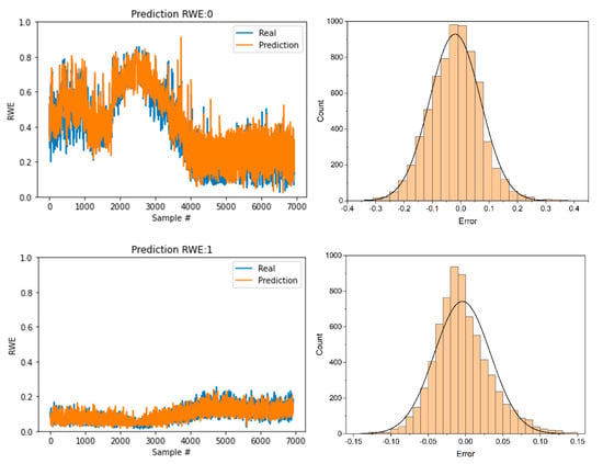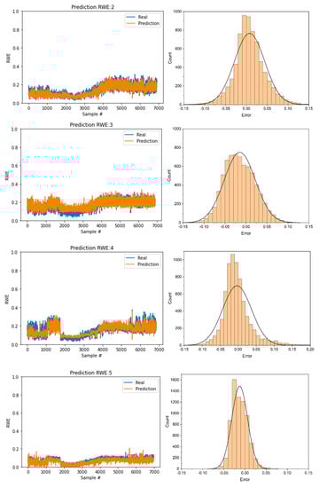 Results of the RWE–LSTM model prediction with five levels of the RWE (left) and histograms of the prediction errors with normal distribution analysis (right).
