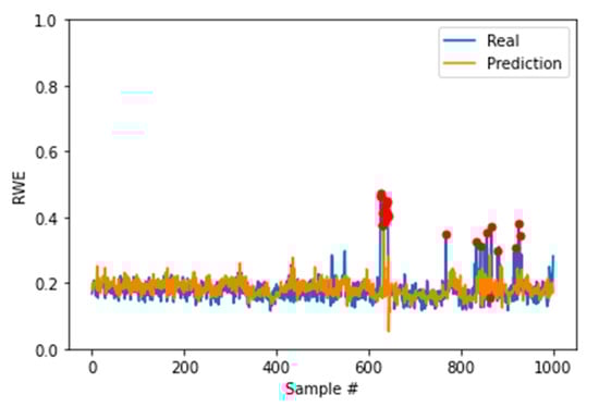 Figure 10 shows the anomaly detection, marked as the red dots in the plot, for the manufacturing machine condition monitoring data in the real running time with three times the standard deviation as the threshold. This finding demonstrates the effectiveness of the trained RWE–LSTM model.