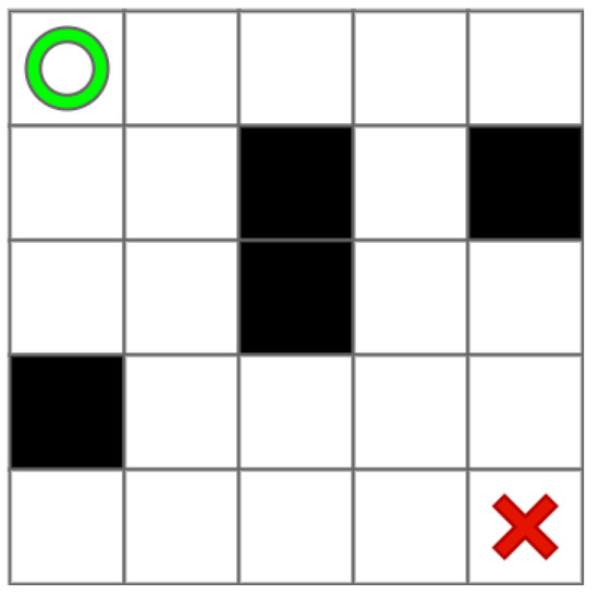 For example, in the 2D environment map shown in Figure 1, the green circle is the starting point, the red cross is the destination point, and the black grid is the obstacle.