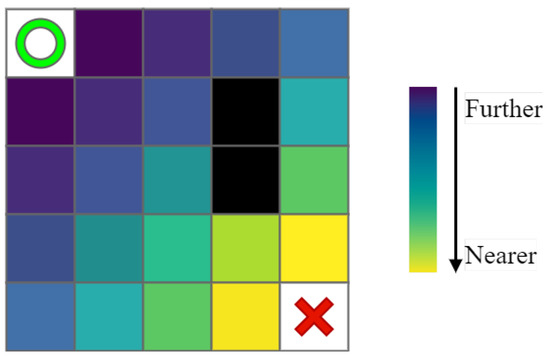 - First, determine the starting and destination points in the environment and calculate the distance between all points except obstacles and the starting point through the Euclidean function, such as shown in Figure 3, where the green circle, the red cross, and the black squares represent the starting point and destination point and obstacles, and the rest of the color squares from deep to shallow represent the size of the prior knowledge of the present points: the deeper the color, the further away from the destination point.