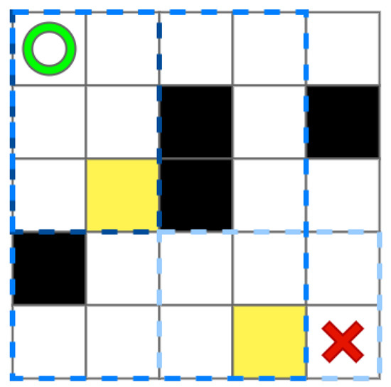 Figure 5 describes the flow of the CLSQL algorithm. The mobile robot starts to search from containing the starting point. When it moves to , it updates the new and and repeats the above steps until the agent reaches the destination point, which represents the end of the whole learning process. In the local environment search process, when the number of learning steps at this stage is far greater than the size of the local environment too many times or the number of iterations is excessive, that is, the optimal solution cannot be obtained, the present in the local environment is deleted, and then another new is determined again. Global optimization can be achieved only when local environment optimization is achieved. The condition of a local optimum is whether the optimal steps correspond to the diagonal distance between two points and , where the diagonal distance, namely the optimal step, is defined as: