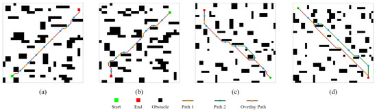 Both Figure 10 and Figure 11 are optimal path graphs obtained by the four algorithms after several independent experiments. Due to the uncertainty of the results generated by reinforcement learning each time, the optimal results are selected to display the above-visualized results, but this does not affect the reliability of the experimental data.