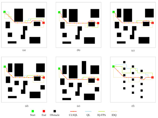 At the same time, it can be observed in Table 2 that the proposed optimization algorithm also shows satisfactory results in terms of path length. This is because the CLSQL algorithm adopts 8 moving directions, compared with 4 moving directions. In objective circumstances, this will increase the dimension of the algorithm, but because of the local search policy, it can comprehensively reduce the dimension required by the algorithm. As seen intuitively from Figure 8, there are many tortuous paths in the path results obtained by the QL, IQ-FPA, and IDQ algorithms, while the proposed algorithm does not yield them. In Figure 8b–e, the CLSQL algorithm obtained the same path length; although the number of obstacles was increased based on the same map environment, the result was not affected. In contrast, other algorithms are negatively affected by additional obstacles (new obstacles), which increase the calculation time and path length of the algorithm to varying degrees.