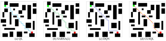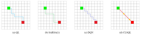 It can be seen from Figure 10 that the CLSQL algorithm can plan the simplest and most direct path, while the paths generated by other algorithms all have turns of varying degrees, as does Figure 11. Figure 10d and Figure 11d show that the CLSQL algorithm can determine the shortest path from the starting point and destination point of the figure because the proposed algorithm at the time of Q-table initialization increases the relevant prior knowledge and increases the purpose of the search process so that in each stage, it can make the mobile robot constantly move toward the direction of the destination point. Remarkably, the DQN algorithm in Figure 11c also obtains a relatively simple path, because the neural network parameters of the DQN algorithm are updated after several learning iterations, which results in its selection policy remaining unchanged for some time, thus suddenly achieving a good path effect in certain learning situations.