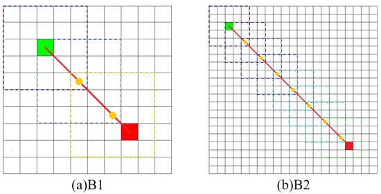 Figure 10 and Figure 11 show the two obstacle-free maps B1 and B2 and the optimal path obtained by using QL [15], SARSA() [29], DQN [22], and CLSQL algorithm, where the green square represents the starting point, the red square represents the destination point, and the yellow circle represents the intermediate point. Paths with different colors represent the results of different algorithms. Since B1 and B2 are obstacle-free maps, grid lines are added to enhance the visualization of the maps. Table 3 and Table 4 record the average data and standard deviation of the four algorithms, respectively. Intuitively, as the map environment increases, it takes longer to compute.