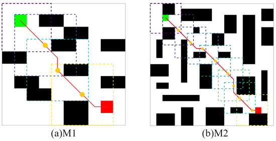 It can be seen from Figure 13 and Figure 14 that the path results of the four algorithms in the two obstacle maps are tortuous. This is because the complexity of M1 and M2 is high and there are many narrow roads in the environment itself, so the algorithm has to obtain the optimal path from these narrow and complex roads.