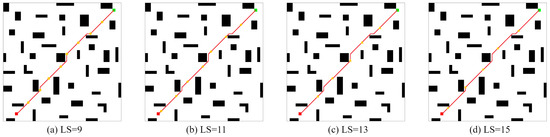 It can be seen from Figure 16 and Figure 17 that in Map1 and Map2, the final path results are consistent when adopting local environments with different sizes because each iteration process in local environments with different sizes follows the prior knowledge of the same environment.