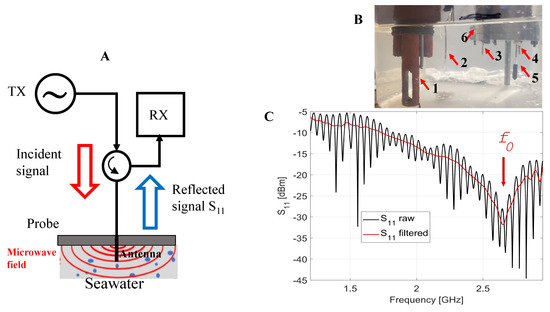 The MiSSo antennas were characterized by the main resonance at = 2.65 GHz corresponding to the 1.7 cm long monopole antenna, as shown in Figure 1C. The characteristic rapid oscillations in the of the Signal (2) were the result of the microwave reflection within long cables connecting the microwave network analyzer, the microwave switch, and the antenna. Signal (2) was independent of Signal (1). In Figure 1C, reflected Signal (1), , is marked red, while the black line represents the sum of Signals (1) and (2) as measured by MiSSo. The standing wave component, (2), can be filtered out from the measured signal. The presence of Signal (2) did not obscure the T and S retrievals. For the analysis of seawater composition, we then used raw data, i.e., consisting of the sum of (1) and (2), as shown in Figure 1C.