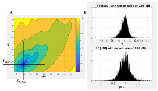 (A) An example of temperature and salinity determination for four frequencies. The color-coded least-squares deviation of a point located at (, ) from minimum value of , for four selected frequencies 2.1222, 2.3411, 2.7454, 2.9255 GHz. In this example, the MiSSo-found S and T was psu and °C. Concurrently, sample T and S values were independently measured by the CT sensor (MiniSonde 4a) and were °C and psu. (B) The histogram of deviations and of the measured T and S from the seawater S and T at selected four frequencies: 2.1222, 2.3411, 2.7454, 2.9255 GHz. Here, the 0.05 dB noise was added to the received signal.